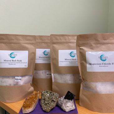 Levitate Wellness is our in-clinic brand of pure magnesium salts to help you rest and recover, relax and unwind! Enjoy Magnesium Chloride flakes, Pure Epsom salts and the Mineral Bath Soak.